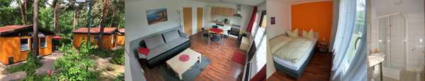 Die Bungalows 7 bis 12 bieten Platz für bis zu vier Personen (Bungalow 7 und 8 bieten Platz für bis zu 5 Personen). In dem großen Aufenthaltsraum mit integrierter Küche steht eine Boxspring-Schlafcouch zum Verweilen und als Schlafmöglichkeit zur Verfügung. Im seperatem Schlafzimmer befinden sich zwei Boxspring-Betten. Außerdem verfügen die Bungalows über ein Bad mit Dusche und WC und einer Terrasse mit Sitzmöbel. Alle Bungalows sind mit einem Backofen ausgestattet (außer Bungalow 9 und 10). |